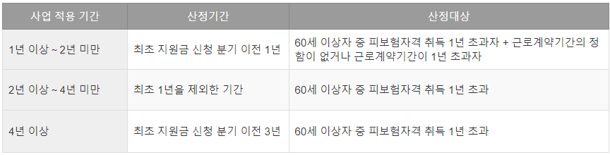 - 매월 마지막 날 현재 고용보험 피보험자격 취득기간이 1년을 초과한 60세 이상 근로자