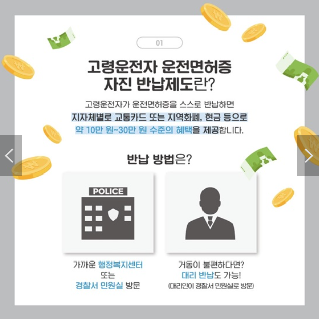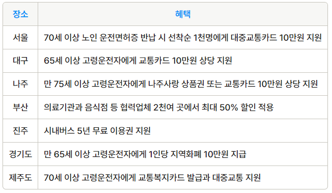 최근 고령운전자와 안전한 도로에 대한 관심이 높아지면서, 운전면허증을 반납하는 고령운전자들에게 지자체에서 교통카드, 지역화폐, 현금 등 10~30만원 수준의 혜택을 제공하고 있습니다. 주행능력 저하로 운전이 걱정되시나요? 오늘 글을 읽으시면 고령자 운전면허 반납에 대해 자세히 알게 되실거에요!