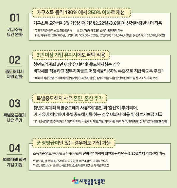 - 대상: 만 19~34세 이하, 금융소득종합과세 미해당자, 개인 급여 7,500만 원 이하, 가구 중위소득 250% 이하