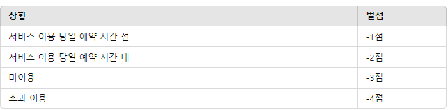 - 당월 누적 벌점 -7점 이상: 당월 사전 예약 내역 취소 및 당월 온라인 예약 불가. 단, 당일 전화 예약(독립반)은 가능하며, 전액 본인 부담으로 이용 가능.