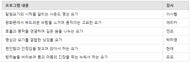 - '레츠 요가'의 실력 있고 트렌디한 요가를 진행하는 리더 6명이 이번 광화문 달빛요가를 맡게 되었습니다.
