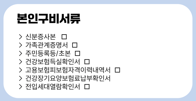- 개인 서류: 주민등록 등본, 초본, 4대 보험가입증명서, 고용보험자격이력내역서