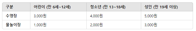 - 침수 위험 시 운영 중단: 폭우로 침수 시 수영장 운영이 일시 중단될 수 있으므로 폭우 시 공지사항을 확인하시거나 각 수영장 및 물놀이장으로 문의하여 주시기 바랍니다.